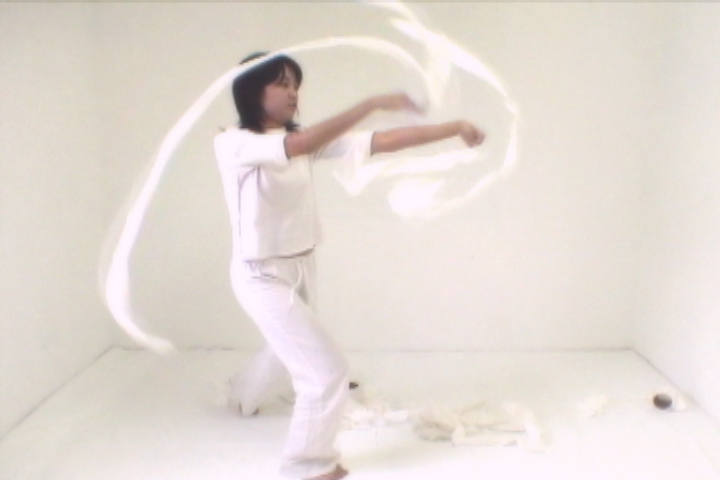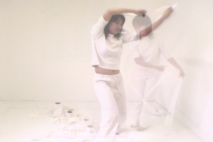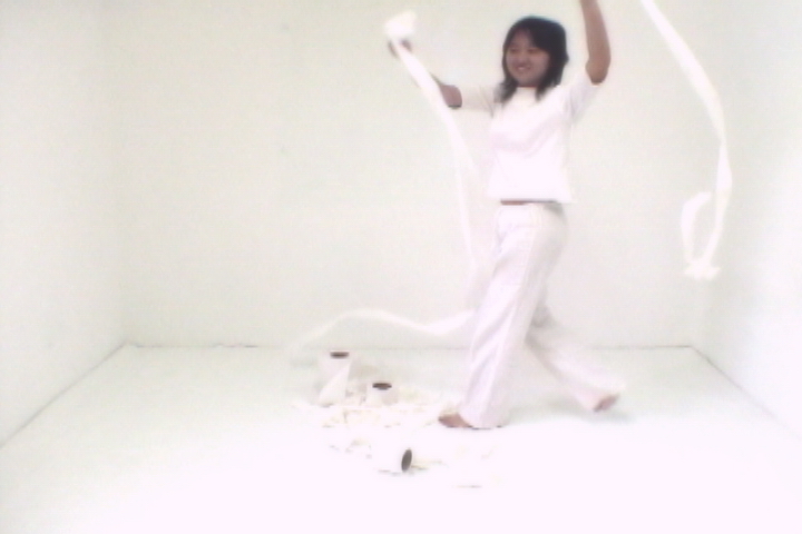 The memories replay. The camera records the designer playing the white toilet paper in the white space. Seeing and dealing the self in the video, the designer recalls the plying in childhood.