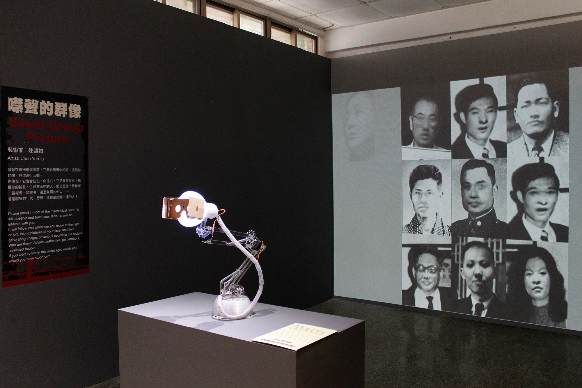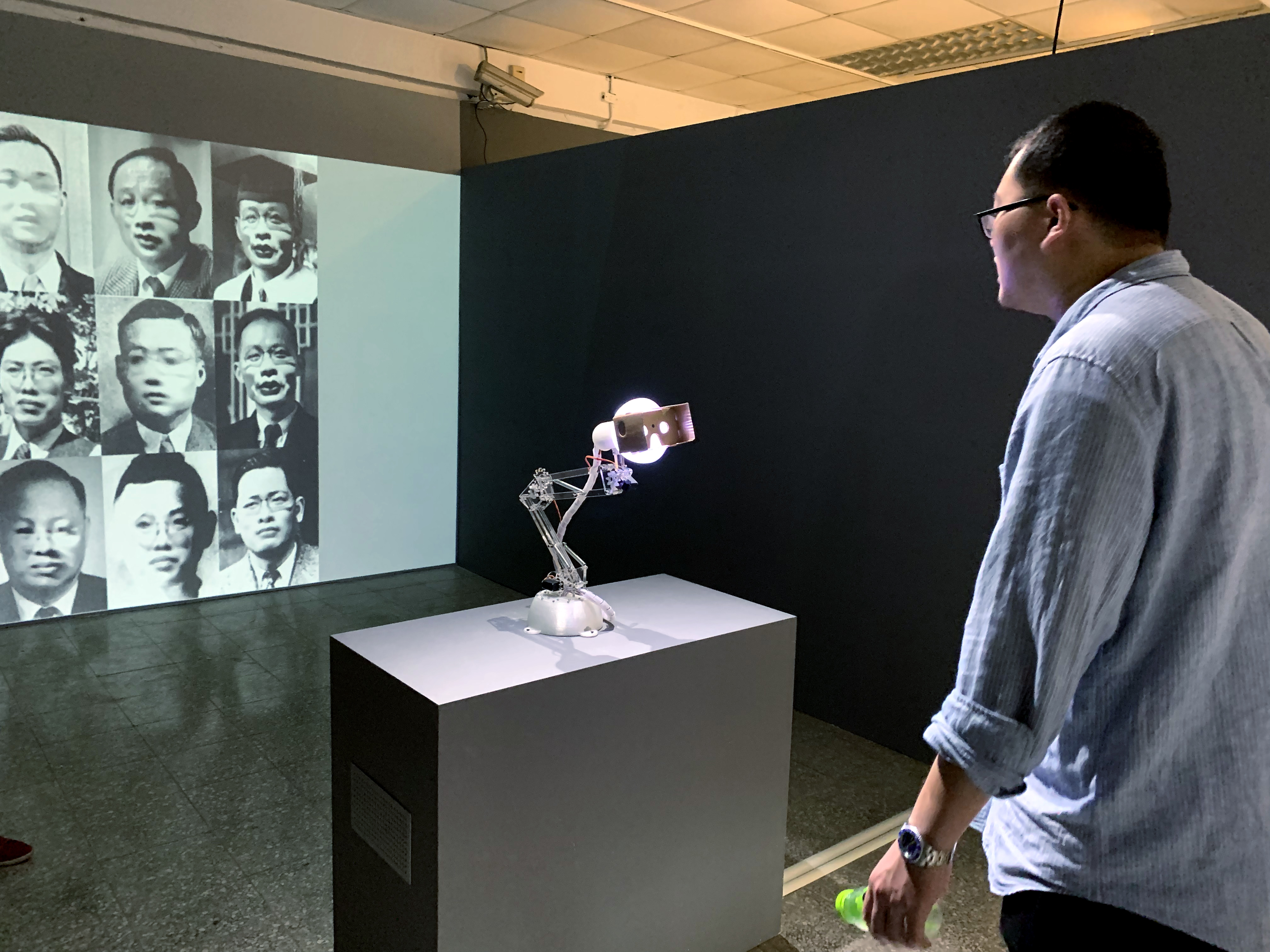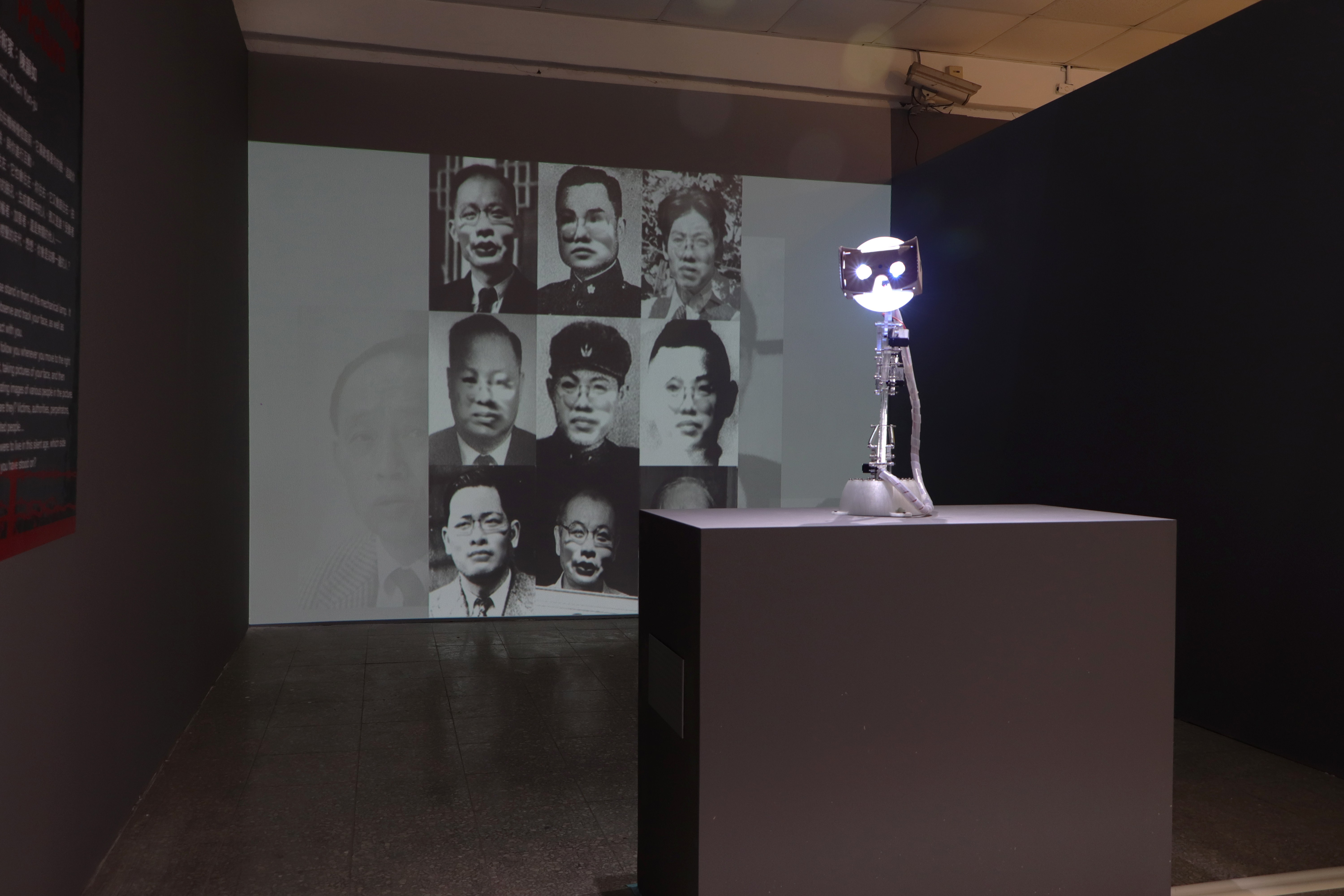 請站在裝置檯燈前面,它喜歡看著你的臉,追蹤你的臉,與你進行互動。你往左,它也會往左,你往右,它也會往右,拍攝你的臉孔,生成畫面中的人。那又是誰?受難者、當權者、加害者,還是無關的他人……