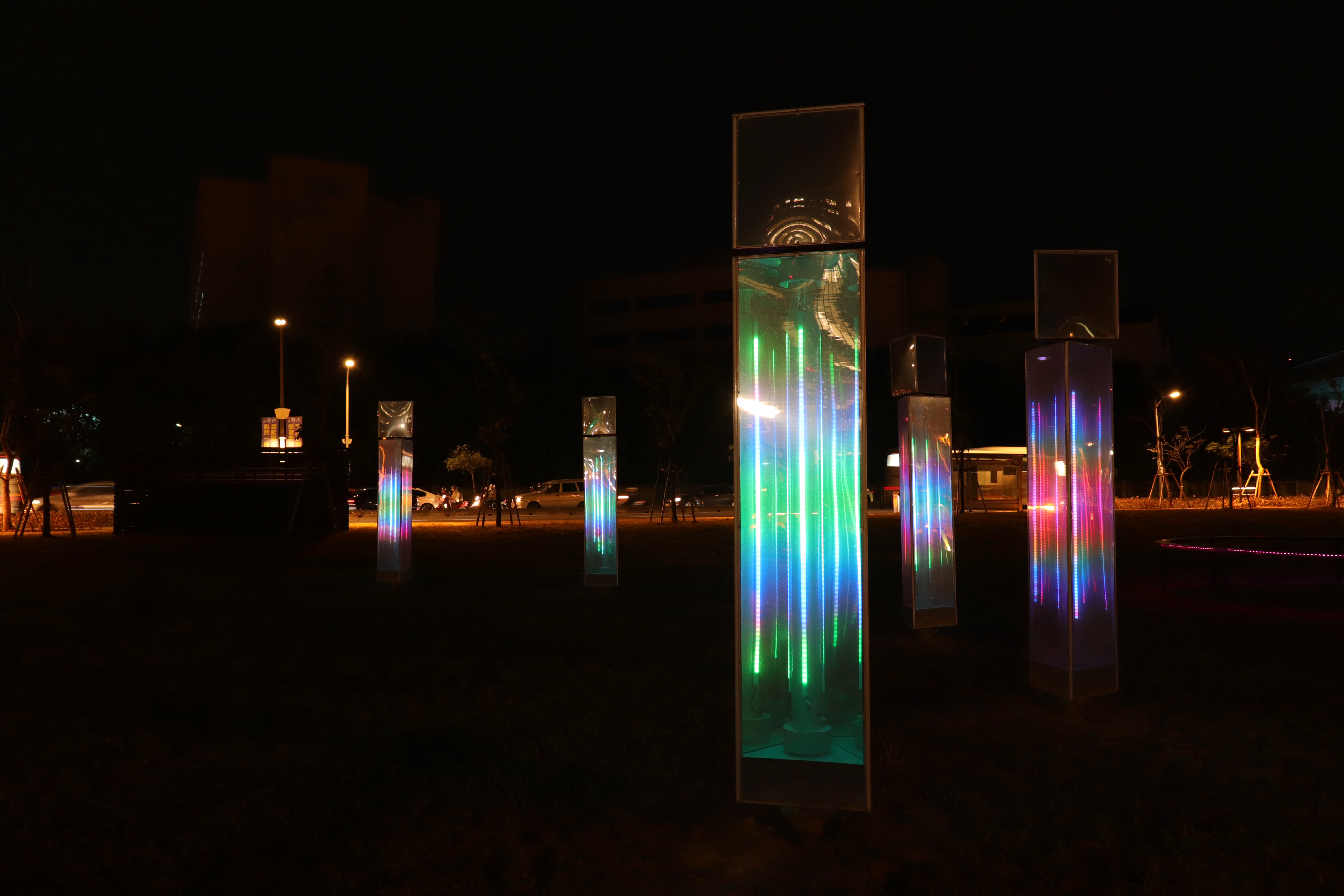 《光合共譜》為六個聲軌的音樂裝置,以混音的形式環繞呈現,它是裝置,也是錄音機,紀錄想念的聲音,並將聲音回放於風中,在彼此的步伐裡,成為對方的回音!在你腦海中是否有一個很重要的聲音如日夜光影隨行,或是來不及說出口的話,那些曾經滴落的淚水,一如音樂裡的時光,把它留下來化作音符,存放在這個時光聲軌之間,撥動共譜出時、光、音、影的脈動瞬間,呈現視聽觸的微妙感受。